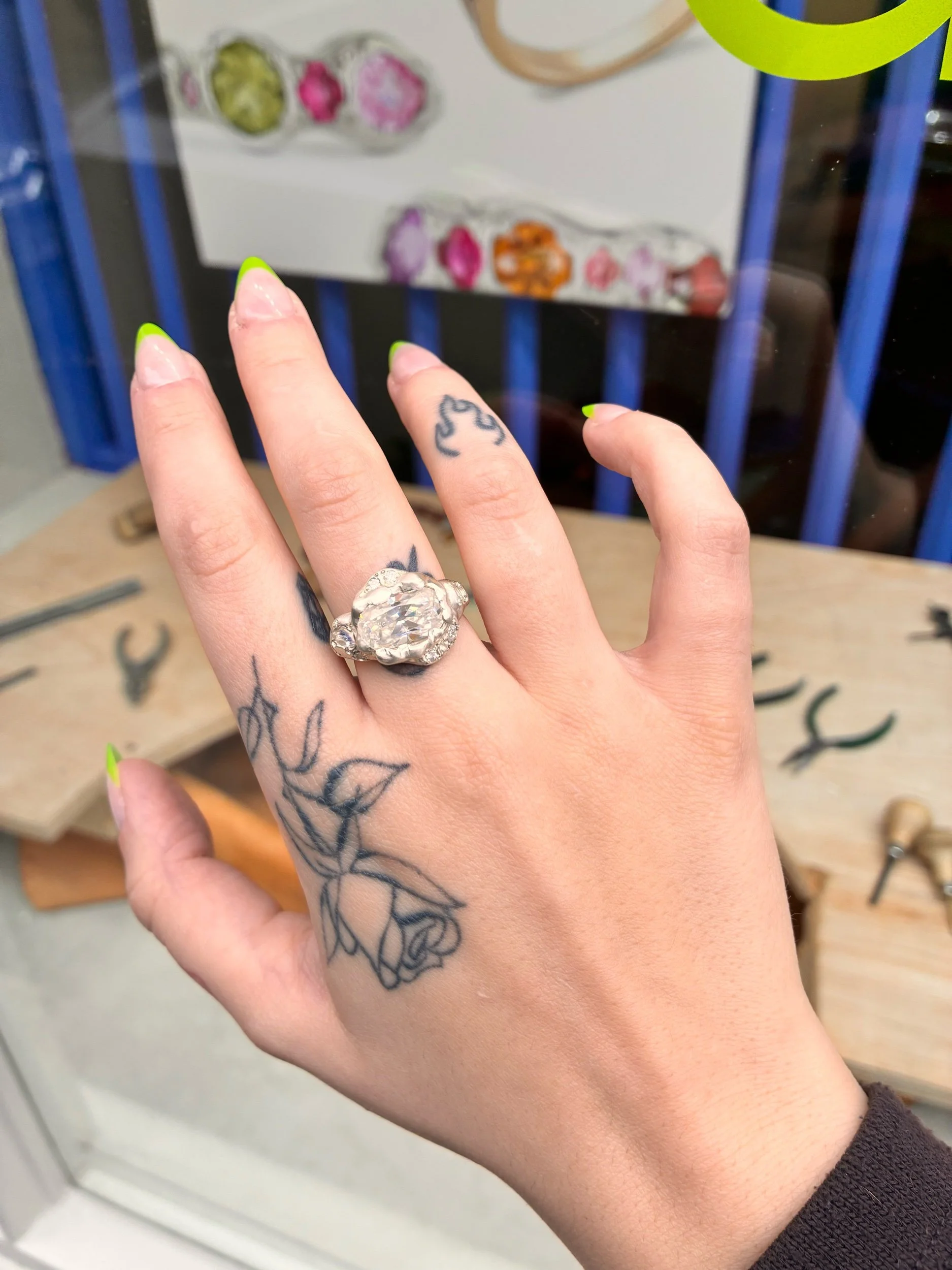 the cloud ring centres a beautiful misty moissanite with an ethereal essence. it inspired the cloud ring to be made, using fun bubbly shapes and moonstone to add to the design.