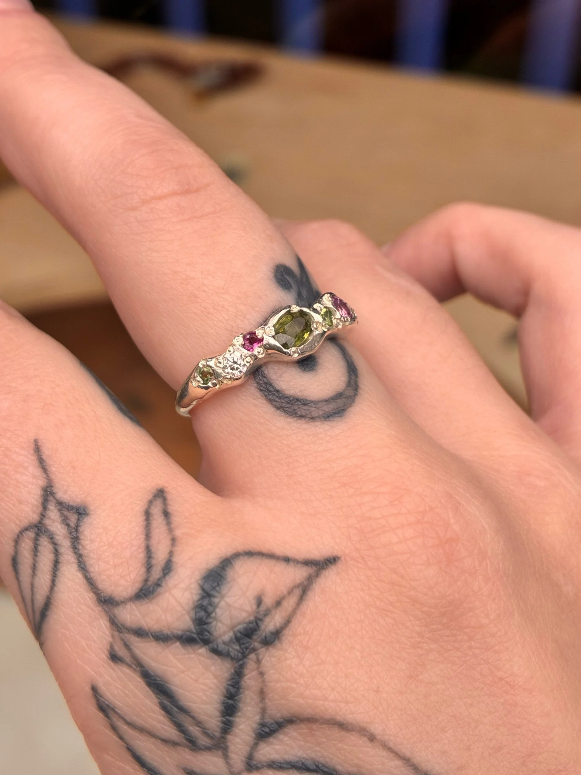 stones → peridot, tsavorite garnet, pink sapphire, lab grown moissanite, ruby