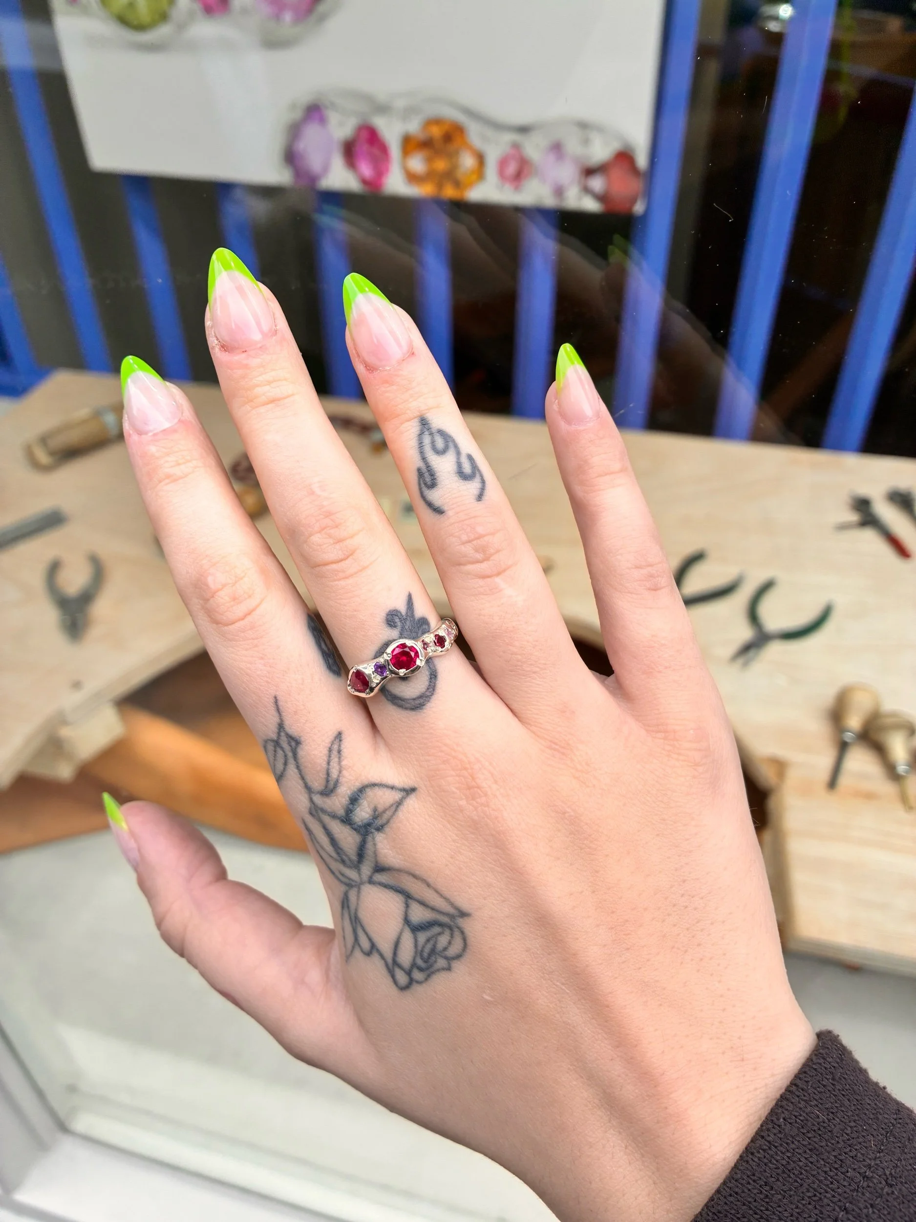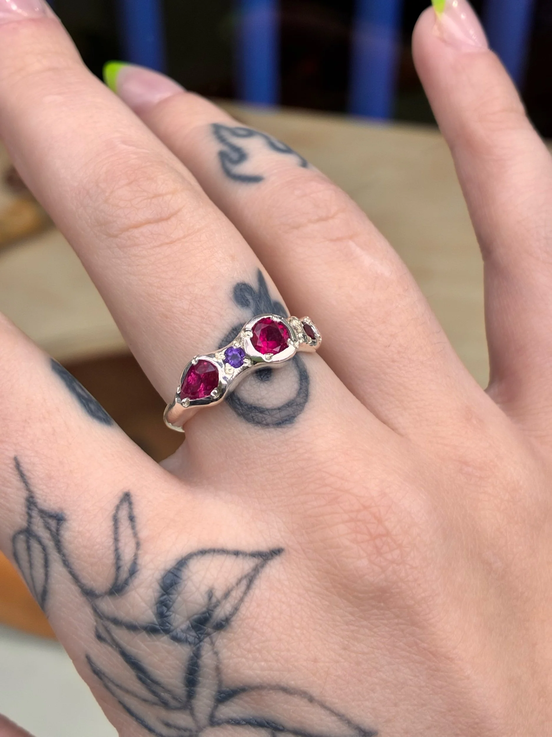 an impactful colourway of amethyst and lab-grown ruby set into susannah’s signature organic style.