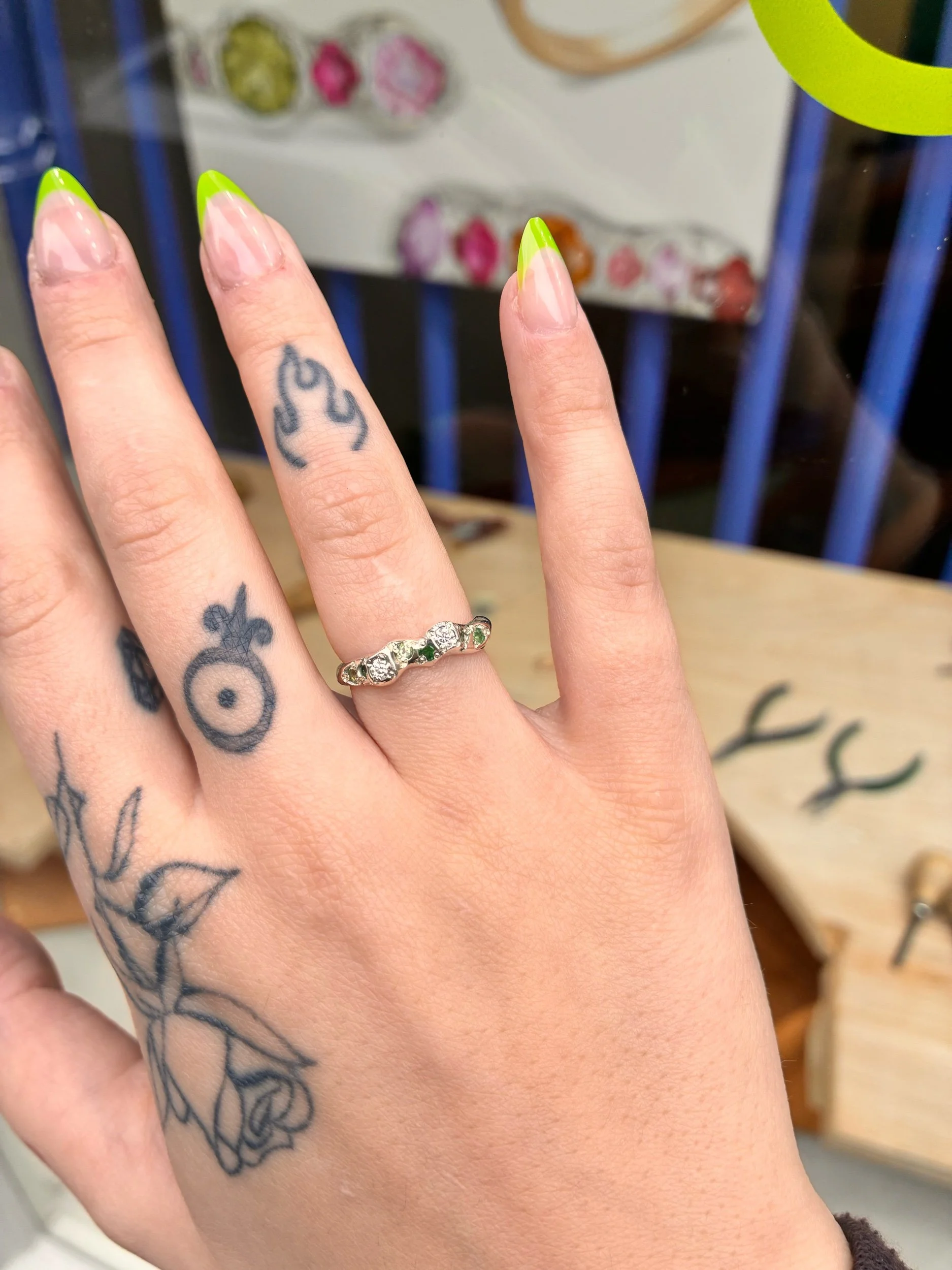 stones → peridot, tsavorite garnet, lab grown moissanite