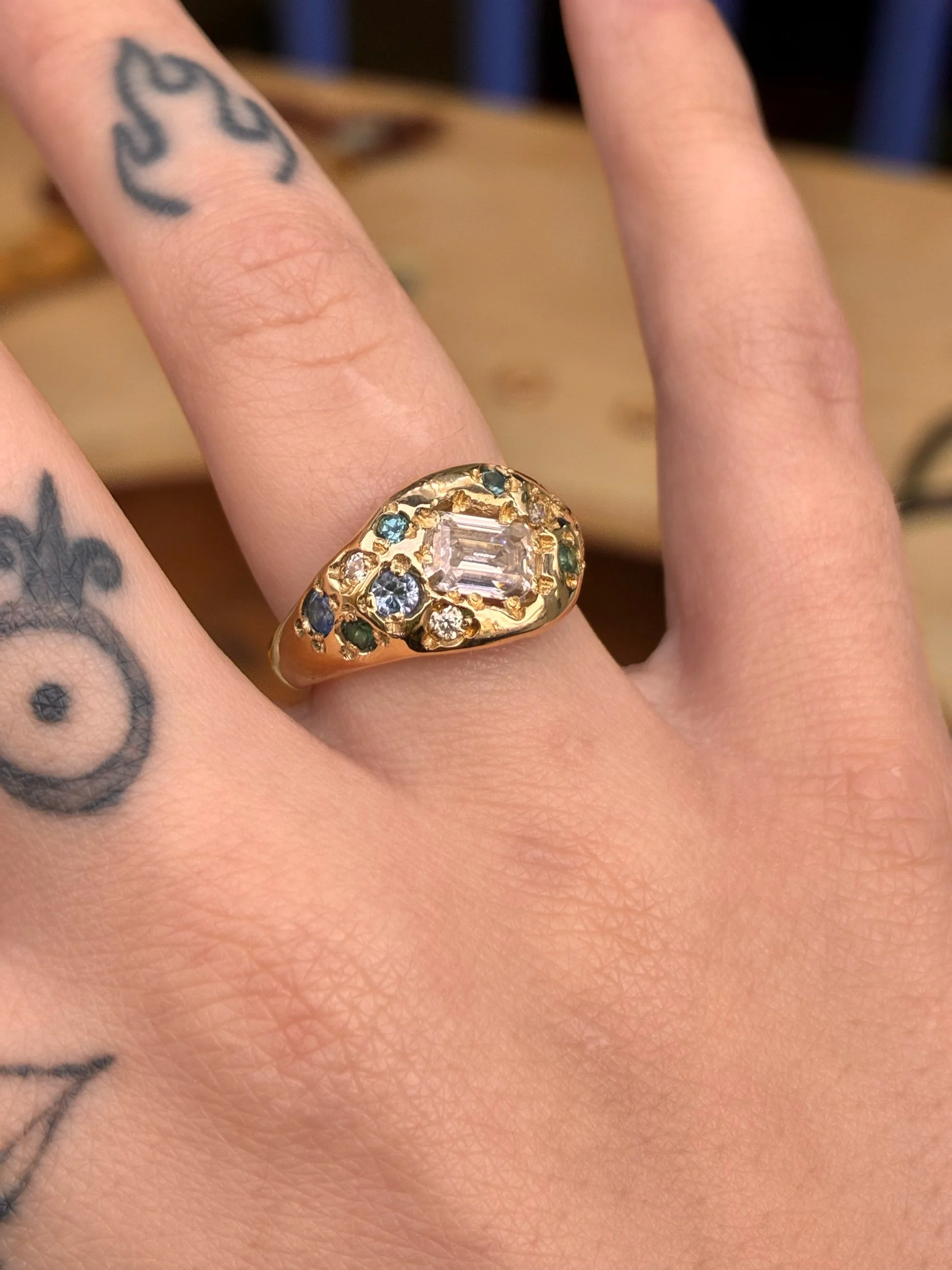 made with gentle palettes of blue in mind, the seafoam statement maker is and interesting shape and form reminiscent of the ocean. the seafoam statement maker adopts sea-dwelling textures through the careful hand-setting of each stone, becoming a piece of art in its making process.
